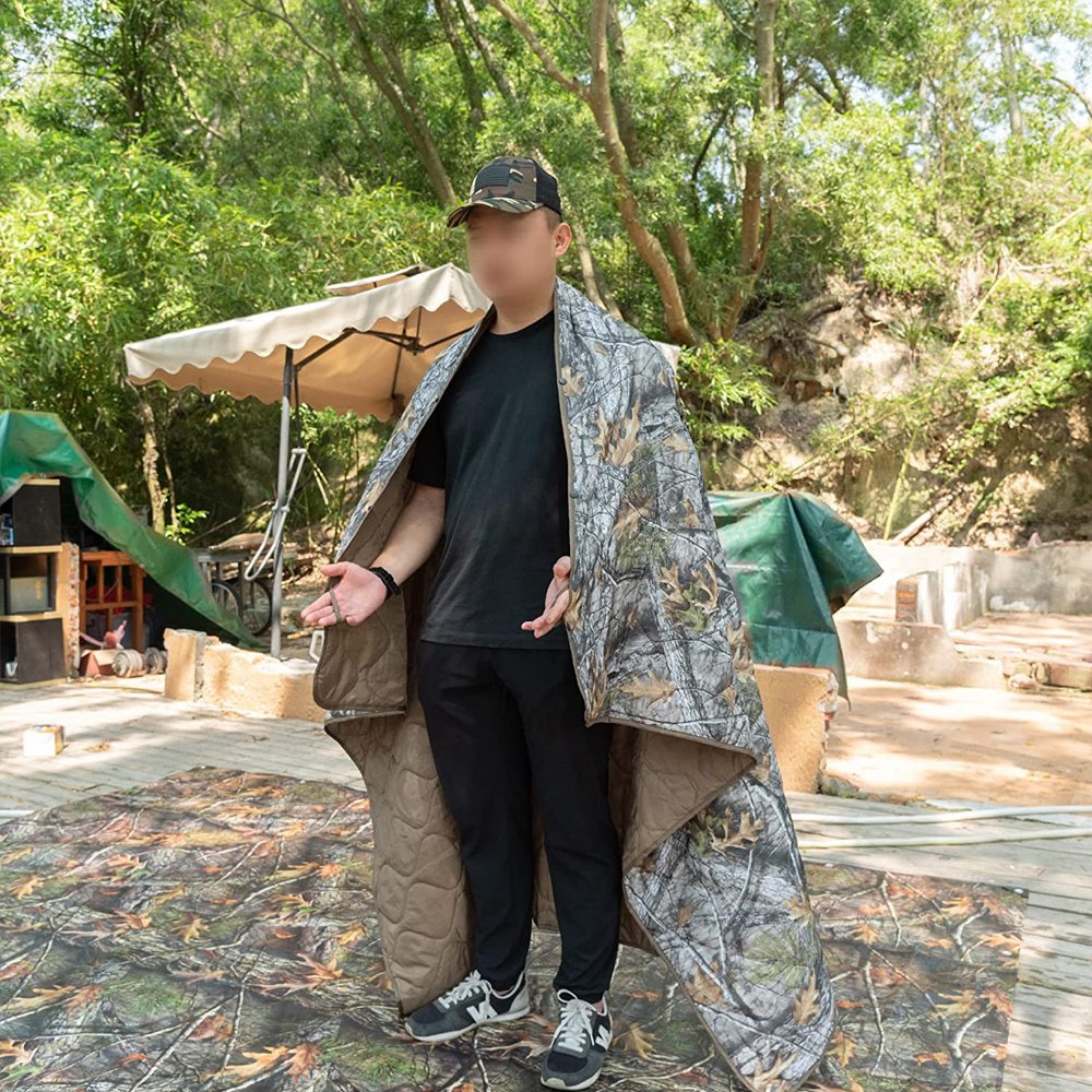 Material:210T Ripstop and filled with spray-bonded cotton WATERPROOF AND WARM BLANKET: The Woobie camo blanket is made of 210T Ripstop and filled with spray-bonded cotton; prevent water from immersion to poncho liner blanket and keep you warm and cozy; widely used in various harsh environments. One-sided with Camo Pattern; another-sided with Deep Khaki. MEASUREMENTS: This Military Emergency Poncho Liner opens up to approximately 140cm by 200cm; weighs 0.75kg and comes with matching compression sack; the bottom diameter of the compression sack is 18cm and the height is 30cm. The Blanket is packable and be fully compressed into its compression sack for easy carry and storage; reduces space and volume. MULTI-USE PONCHO LINER: Just Click the Three Premium Double Snaps can easily turn your blanket into a poncho; and keeps you hands free for chatting around the campfire; tailgating; or cozying up with your favorite book. Snaps straight into a poncho opposed to tying is a more secure attachment for sure. MULTIPURPOSE: The survival woobie blanket can be used as camping and outdoor blanket; beach mat; picnic mat; poncho; but alse a fun option at home for enjoying outdoor movie nights or fire-pits. This lightweight and compact camo blanket is great to make your camping; hiking; backpacking; picnicking; hunting; and fishing trips so much easier. PRACTICALITY: There is no more practical a piece of gear than the woobie/poncho liner! Warm but it breathes; lightweight and easy to pack; store; and wash. The waterproof army blankets can hand or machine wash; which make it are easier to maintenance.